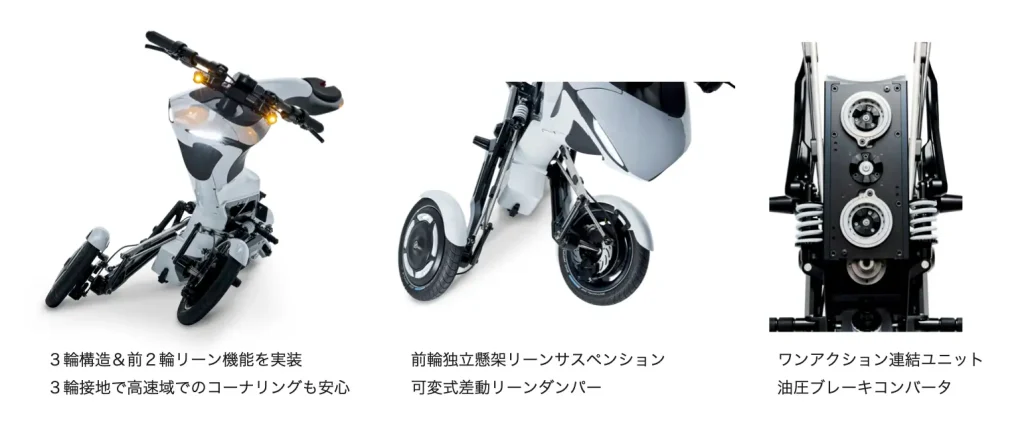 高速スラロームターンも簡単に楽しむことができるため、モータースポーツの興奮と快適な走りを全世代に提供します。また、前輪独立懸架リーンサスペンション、可変式差動リーンダンパー、ワンアクション連結ユニット、油圧ブレーキコンバータといった高度な技術も搭載しています。これにより、使う人すべてが乗り物のカッコ良さと楽しさを実感できるように設計しています。